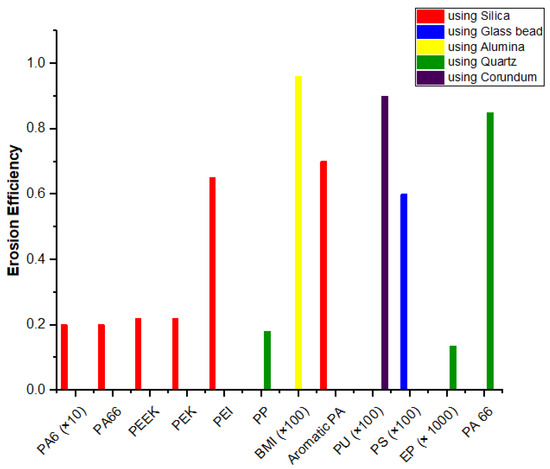 As discussed earlier, the particle erosion behavior of polymers has been explored by many researchers. The specific materials studied include polystyrene [62], polypropylene [63,64], nylon [65], polyethylene [66], ultra-high-molecular-weight polyethylene [67], polyetheretherketone [68], polycarbonate and polymethylmethacrylate [69], epoxy [70], bismaleimide [71], elastomeric materials [72,73], and polymer composites. Several thermoplastic/thermoset-based hybrid materials have been studied for erosive performance [74,75]. The details of the minimum reported erosion efficiency and erosion rate under optimized conditions are presented in Figure 4 and Figure 5, respectively. Owing to the difficulty of visualizing such a wide range of values in a presentable form, multipliers for some polymers are given in the labels. The literature has shown that the use of ductile elastomeric polymers is a popular choice for erosion resistance. Thermoplastic composites have competed with epoxy composites due to their elevated strength and stiffness, high strain towards malfunction, low water absorption, and infinite shelf life. Consequently, these composites are frequently utilized in parts where wear problems are of major concern.