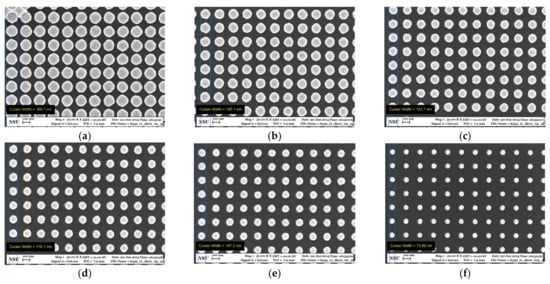 Representative high-resolution SEM images of Au nanocluster arrays with a period of 200 nm and various nanocluster diameters: (a) 170 nm, (b) 145 nm, (c) 132 nm, (d) 116 nm, (e) 107 nm, and (f) 74 nm.