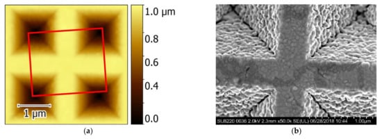 Another type of plasmonic substrate used in SERS experiments called Klarite® structure consists of arrays of inverted Si pyramids as shown in AFM image Figure 3a. They were available as commercially plasmonic substrates especially developed for SERS experiments. As can be seen from Figure 3b, the surface of the Klarite substrate is homogeneously covered by Au nanoclusters with irregular shapes and sizes of about 50–100 nm []. The pyramid base is a square with a size of 1.5 × 1.5 µm2, while the pyramid depth is 1 µm. The inverted pyramids act as resonators and provide an electromagnetic field enhancement inside the cavity at the vertices of the pyramids [].