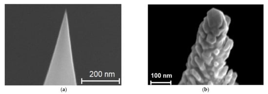 Tips for the TERS experiments were prepared by depositing an Au layer on commercially available AFM tips. Standard Si AFM cantilevers purchased from Tipsnano (Tipsnano, Tallinn, Estonia) with a specified tip radius of <10 nm as shown in Figure 4a were used as the basis for the TERS probes. A titanium 5 nm-thick layer for better adhesion and a gold layer with a nominal thickness in the range of 150–200 nm were thermally evaporated onto the apex of the commercial AFM cantilever []. To reveal the morphology of the tip, SEM images (Figure 4a,b) were acquired before and after the metal deposition process. As can be seen from Figure 4b, the metal deposition results in the formation of polycrystalline Au grains on the AFM tip and a single gold nanocluster with a typical size of about 80–90 nm is formed at the tip apex.