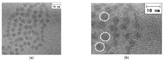 (a) HRTEM image of CdSe NCs lying on Si substrate. (b) Zoomed area of HRTEM image (a) with some NCs highlighted by white circles illustrating the crystalline structure of NCs.