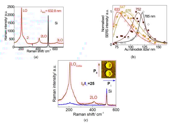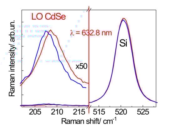 SERS was successfully used to study the structural evolution of the interfaces in colloidal CdSe/CdS and CdSe/Cd0.5Zn0.5S core/shell NCs interacting with Ag plasmonic substrates []. Hybridization of Au nanowires with CdSe/ZnS core/shell NCs provides an overlapping of the surface plasmon band and the NCs absorption range allowing localized and surface optical phonon modes to be studied in both the CdSe core and the ZnS shell []. The LO phonons of a monolayer of CdSe NCs deposited onto a commercial gold SERS substrate (Klarite) can be detected by SERS at 208 cm−1 []. With the choice of the excitation wavelength (514, 633, or 785 nm), the condition for resonant SERS can be achieved and pave the way for using NCs as SERS markers [].