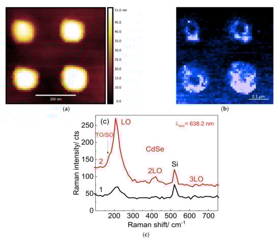 A comparison of conventional Raman and SERS spectra of a CdSe NC monolayer is shown in Figure 9a. The Raman spectrum measured outside of the area of the plasmonic nanostructures for CdSe NCs on the bare oxidized Si substrate corresponds to the Raman spectrum of the Si substrate (Figure 9a, spectrum 1). No evidence of CdSe phonon modes was detected due to insufficient sensitivity of this conventional Raman measurement towards the small amount of CdSe NCs on the surface. However, the SERS spectrum reveals the LO phonon mode of CdSe NCs near 200 cm−1 [], as well as higher-order overtones (2LO and 3 LO).