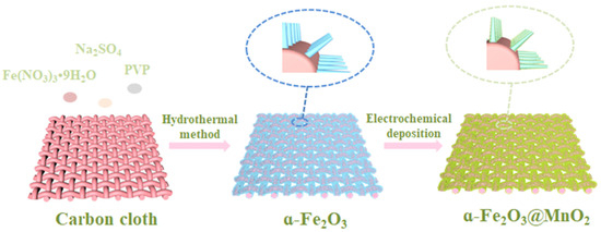 Figure 1 presents the growth process of α-Fe2O3@MnO2 products on carbon cloth. Firstly, α-Fe2O3 nanorods are obtained via a facile hydrothermal approach. Afterwards, a layer of MnO2 film is deposited by subsequent electrochemical deposition on the nanorod-shaped α-Fe2O3 surface.