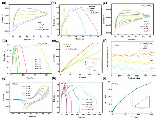 Electrochemical performance. (a) CV curves. (b) GCD curves. (c) CV curves of α-Fe2O3@MnO2. (d) GCD curves of α-Fe2O3@MnO2. (e) Nyquist plots. (f) Cycling performance at 4 mA cm−2. (g) NiCo2S4 CV curves. (h) NiCo2S4 GCD curves. (i) NiCo2S4 Nyquist plots.