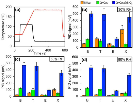 The QxCav@SiO2 preconcentrator was tested in the commercial mini-GC system PyxisGC BTEX, equipped with a MiniPID 2 ppb by ION Science (UK) [5]. The same measurements were conducted on bare silica and pure QxCav as control experiments. Each MEMS cartridge (Figure S1) was filled with 50 mm3 of bare silica, QxCav and QxCav@SiO2, respectively, corresponding to roughly 100 mg of material for silica and QxCav@SiO2 and 50 mg of QxCav. The sampled air contained a mixture of BTEX from a certified cylinder, each of them at a 3-ppb concentration, except for the p-xylene present at a 6-ppb concentration. The air was humidified at 30, 50 and 80% RH to mimic real ambient conditions. A flow of 250 sccm of the humid sampled air was pumped into the preconcentrator for 300 s at 25 °C. At the end of preconcentration, the embedded 3-way mini-valve was switched, connecting the preconcentration unit to the GC pump. The temperature of the MEMS was raised up to 110 °C to promote the desorption of the analytes with an inverted air flux of clean indoor air. The desorbed analytes were injected into the MEMS GC separation column for 40 s. The mini-GC column operated in a temperature ramp from 50 to 185 °C in 140 s in order to maximize the separation of peaks. A typical chromatogram is reported in Figure 2. The detection of each analyte was provided by a photo ionization detector (PID) positioned at the end of the MEMS column. At the end of injection, the preconcentrator was cleaned for 2 min at 110 °C. After cooling the entire apparatus to 25 °C in 120 s, new air sampling began. A single measurement takes 10 min to be completed, enabling a benzene detection limit of 0.8 µg m−3. Longer cycle times allowed for even higher sensitivity by increasing the sampling time (Figure 3a). As shown in Figure 2, all analytes were separated well under these experimental conditions.