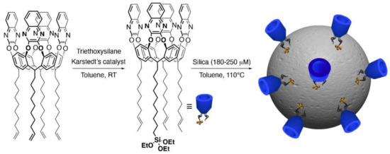 The experimental details, including the materials and apparatus, are listed in the Supplementary Materials. The precursor QxCav with four ω-decenyl feet was prepared by following a previously published procedure [14]. Mono-hydrosilylated QxCav was synthetized by adapting a previously published procedure [15].