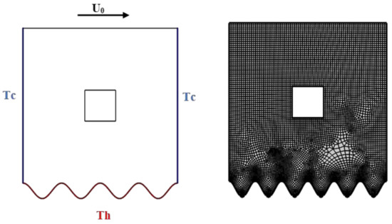 A lid-driven cavity is a technical term for a completely enclosed chamber containing a fluid in which one of its walls undergoes horizontal motion [7,8,9,10]. Several studies have been carried out on this subject for the purpose of presenting the elements that contribute to raising the heat transfer between the internally retained fluid and the chamber walls [11,12,13,14,15]. In general, it is understood that thermal transfer is related to two main issues, namely, the fluid’s thermal proprieties and the chamber’s geometrical shape.