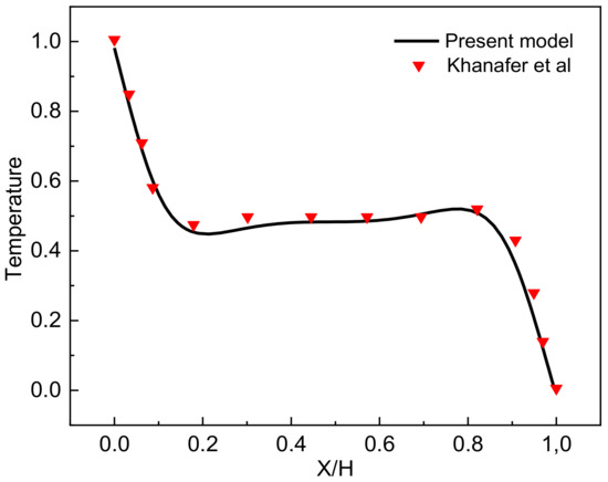 Grid independency is checked by testing the effect of the mesh size on the average Nusselt number for several mesh configurations (Table 2), and a grid size of 40,600 is selected. To assure the accuracy of the numerical method of the adopted code, the flow behavior is represented by streamline, the thermal behavior is represented by an isotherm that is compared with the former numerical research published by Khanafer et al. [57]. Figure 2 shows the comparison between the results for the profile dimensionless temperature. Comparing the results, it is noted that there is a great agreement between them. Accordingly, it can be said that the method adopted in this work is very accurate.