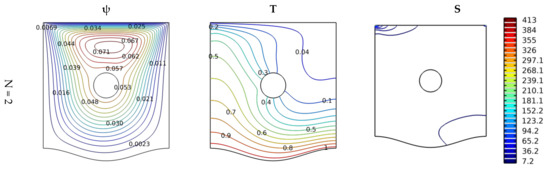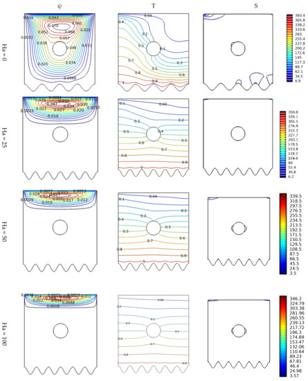Figure 5 depicts the effect of the increase in the intensity of the magnetic field on the movement of the nanofluid particles, thermal diffusion, and the distribution of entropy generation. The presence of a magnetic field produces a Lorentz force that acts opposite to the buoyant force. Therefore, the appropriate contours are, respectively, shown in terms of Ha number for N = 8, Gr = 103, and Da = 10−2; the cross-section always remains circular. Therefore, we note that the flow movement is concentrated only in the upper face near the moving wall. Also, the greater the value of Ha, the greater the contraction in the size of the circular region of the flow. This decrease in the flow speed, especially near the hot wall, resulted in a decrease in the resulting temperature gradient and total entropy generation, as shown in the appropriate elements of Figure 5.