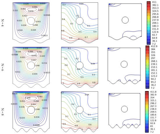 Distribution of streamlines, isotherms, and isentropic contours for various undulation numbers N at Gr = 103, Ha = 0, and Da = 10−2.