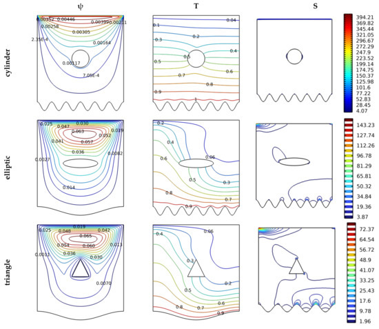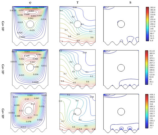 Figure 4 explains the effect of thermal buoyancy strength on flow movement and its retroactive influence on thermal transfer. Therefore, the streamlines, isotherms, and isentropics are represented in terms of Gr (102, 103, and 104) for Ha = 0, Da = 10−2, and N = 8. The circular form is selected for the insulated obstacle. Figure 4 enables us to conclude that the greater the value of Gr, the greater the intensity of buoyancy impact, and this is what makes the velocity of the flow important in the space. Also, the velocity of the flow leads to the deviation of the center of the rotation of the flow downwards. As for the thermal pattern (isotherms), an increase in Gr value increases the temperature gradient near the bottom side of the container, reflecting positivity on the thermal transfer process between the wavy wall and the fluid elements. As for the contours of isentropic, the expansion of the total entropy diffusion in terms of Gr values is observed, and this is, of course, a result of the increase in the fluid velocity due to the force of buoyancy. It can be summarized that increasing the value of Gr increases the density of the cold spots and increases the dilation of the hot spots of the fluid, which makes them move rapidly. It can be concluded that simply raising the value of the Gr number increases the effect of buoyancy force and, therefore, an increase in the speed of the nanofluid particles’ transfer, and this is what makes the thermal transfer and entropy generation more effective.