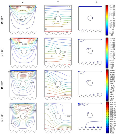 Figure 3 reflects the nanofluid’s thermal, dynamic and energetic behaviors in terms of the change in the lower wall wave number for Gr = 103, Ha = 0, and Da = 10−2. The cross-section in this case of the obstacle is circular in shape. Through the fluid motion contours (streamlines), it is shown that there is a circular flow arising inside the chamber. The center of this circular motion is just above the baffle. It can be seen that the high wall wave number leads to the obstruction of the flow on the lower side, and this reduces its velocity. This effect causes a decline in a thermal distribution near the bottom wall, i.e., we find a decrease in the temperature gradient in terms of the increase in the wave number, and, i.e., we can conclude here that an augmentation in the wave number reduces thermal activity. This analysis can also be verified by the entropy generation values that appear on the upper side of the container on the right and on the lower side on the left. That is, in these areas, the movement of the fluid elements is very important; this makes the energy distribution here important. Through Figure 3, it is clear that the wave shape of the bottom of the chamber makes the movement of the nanofluid particles more difficult. Therefore, a decrease in flow velocity is observed, which decreases both heat transfer and entropy generation.