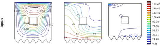 The baffles’ form is very important in directing the flow, which hinders its progress or helps it. Figure 7 shows the effect of the baffle’s cross-sectional shape (circular, elliptical, triangular, or square) on the thermal and dynamic comportments of the hybrid nanofluid. The effect of this change is made for the following values Da at Gr = 103, N = 8, and Ha = 0. From Figure 7, we note that the path of the fluid is affected by the shape of the cross-section of the baffle. The flow velocity is considered for the triangular and the square shapes. Also, the temperature gradient near the hot wall is considered for the triangular shape and, then, the square shape. The triangular shape allows for more quantity generation of entropy, followed by the square shape. The same goes for the entropy generation.