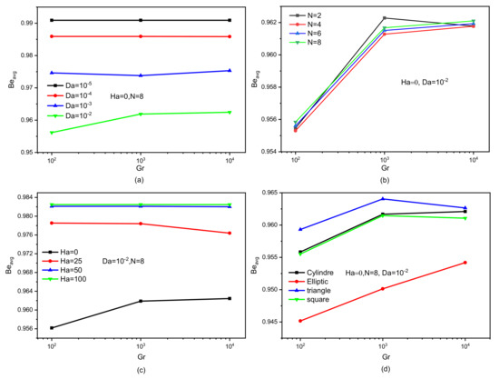 Figure 9 shows the influences of the studied elements on the values of the Bejan number. This number expresses the ratio of entropy formed due to thermal source over the entropy resulting from the friction of the fluid layers. From all the charts in Figure 9, it is clear that the entropy generated due to thermal activity is dominant in this work. Figure 9a shows the influence of Da for Ha = 0 and N = 8. Since the permeability of the space increases in terms of Da, the value of Be decreases because the movement of the flow increases the friction. Figure 9b represents the variation of Be in terms of the wave number for Ha = 0 and Da = 10−2. Of course, the greater the wave number, the less the flow’s movement, which causes the values of Be to increase. Figure 9c is intended to show the effect of Ha on Nu for Da = 10−2 and N = 8. It was found previously that the increase in the value of Ha negatively affects the speed of the flow, and this is what makes the thermal effect on entropy generation. Therefore, we note that the higher the Ha peak, the more important is the Be value. Figure 9d shows the effect of the cross-sectional shape of the baffle on Be for Ha = 0, N = 8, and Da = 10−2. The effect of the cross-section of the baffle on the Be value is actually observed due to the shape of the obstacle that changes the kinetic path of the flow.