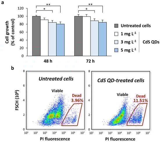 Then, we evaluated the inhibitory effect of CdS QDs (at doses of 1–5 mg L−1) on the yeast growth in a medium that induces the sporulation in diploid cells after 72 h. The exposure to CdS QDs caused a lower inhibition of the yeast growth in the sporulation medium (Figure 2a), compared to the fermentative conditions (Figure 1b). In fact, it is known that the sporulation process produces spores that are more resistant to environmental stresses than vegetative cells. To further evaluate if the treatment with CdS QDs did not significantly affect the viability of the cells under sporulation conditions, an experiment was conducted staining the yeast cells with PI (Figure 2b), a dye that allows the discrimination of viable (PI−) and dead (PI+) cells. The percentage of viable cells in the sporulation medium obtained by cytofluorimetric analysis in the control (untreated) cells was about 96% of the total cells (Figure 2b). The treatment with CdS QDs at the highest doses tested (5 mg L−1) slightly reduced the percentage of viable cells after 72 h (by about 8%; Figure 2b), in line with what was observed in the growth curves (Figure 2a).