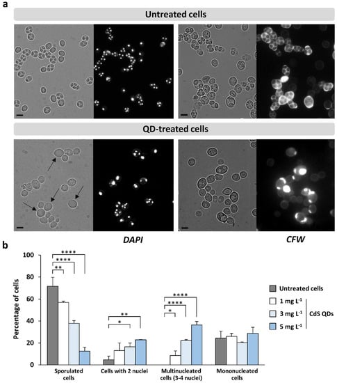 CdS QDs strongly affect the sporulation process. (a) Z239-6B-6B diploid strain was grown in sporulation conditions in the presence (or not) of CdS QD treatment (1–5 mg L−1); after 72 h, cells were then stained with DAPI and calcofluor white (CFW) and analyzed using fluorescence microscopy. CdS QD treatment caused the formation of asci containing three or four nuclei but with the absence of refractile spores (multinucleated cells, indicated by black arrows). Representative images (scale bars, 5 µm) of untreated and CdS QD-treated (5 mg L−1) cells are shown. (b) The percentage of cells (relative to the total number of cells stained with DAPI) representative of each phenotypic category was quantified. The values shown in the histograms are the mean (±standard deviation) of three independent experiments performed in triplicate. Significance was determined by one-way ANOVA with Dunnett’s multiple comparisons test. * p < 0.05; ** p < 0.01; **** p < 0.0001.