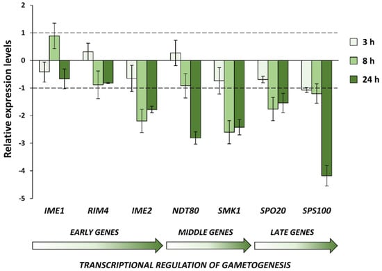 To determine whether the morphological alterations induced by CdS QDs were related to a transcriptional reprogramming of the gametogenesis process, a set of meiosis-specific genes expressed in different phases (early, middle, and late) of the sporulation process was analyzed by real-time PCR (Figure 7). Cells were grown for different time periods (3, 8, and 24 h) in the sporulation medium with (or without) the supplementation of CdS QDs, and total RNA was extracted from each sample; cDNAs were then synthesized and analyzed by real-time PCR using ACT1 as the housekeeping gene.