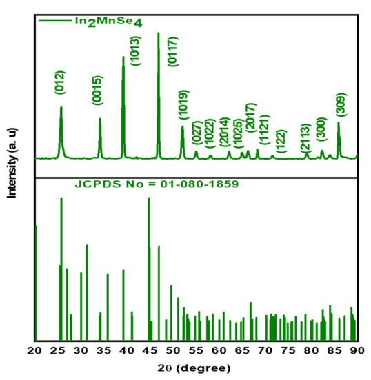 The crystal structure, geometry, purity, and orientation of as-prepared indium manganese selenide were analyzed by executing XRD characterization as shown in Figure 1. The diffraction peaks of In2MnSe4 appeared at 2θ = 25.6⁰, 33.9⁰, 39.2⁰, 46.7⁰, 52⁰, 54.8⁰, 57.9⁰, 61.9⁰, 64.8⁰, 66.1⁰, 68.2⁰, 71.5⁰, 78.8⁰, 82.2⁰, 83.8⁰, and 85.9⁰, and can be indexed to the planes (012), (0015), (1013), (0117), (1019), (027), (1022), (2014), (1025), (2017), (1121), (122), (2113), (300), and (309), respectively. The resultant planes were accurately matched with JCPS card no. 01-080-1859. The sharp and well-defined XRD pattern of the prepared structure and absence of the secondary peaks confirms the pure crystalline phase of the prepared material. The crystal planes thus obtained correspond to the rhombohedral nanostructure with cell constant values of a = 4.051 Å, b = 4.051 Å, and c = 39.464 Å. The following expression was utilized to measure the crystallite size of the In2MnSe4 nanomaterial using the Debye Scherrer Equation (6) [42].