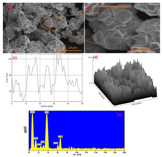 The surface dimension, shape, and particle size of the produced material were investigated using scanning electron microscopy (SEM). SEM micrographs indicates that the material exhibited a flowery shape with a definite crystalline boundary as shown in Figure 3a,b. These flowery nanocrystals are responsible for plenty of electrochemically active sites and facilitate the redox reactions at the electrode, thus showing significantly outstanding electrochemical performances for OER. The crystallite size of the fabricated nanoparticle was 83.28 nm, calculated from an SEM micrograph by IMAGE.J software as shown in Figure 3c,d using plot profile and surface plot.
