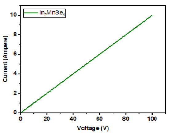 where I = current, V = applied voltage, L = the thickness of the pellet, and A = the cross-sectional area of the pellets. The variation as a function of current concerning the voltage is seen in Figure 5. The grown nanostructure performs an excellent choice for OER because of its ohmic nature.