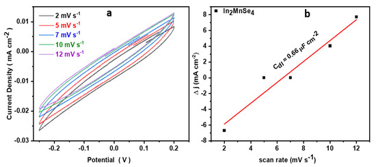 In addition to the non-Faradaic zone, an electrochemical active surface area (ECSA) study was investigated using CV curves at different scan rates between 0 and 0.1 V vs. Ag/AgCl, as shown in Figure 7a. The resultant electrical double layer capacitance of 0.66 mF calculated by plotting the scan rate vs. change in the current density. The obtained double layer capacitance was used to calculate the ECSA of In2MnSe4, and was found to be 16.65 cm2, considering the specific capacific capacitance of the 0.04 mF cm−2 using equation ECSA = Cdl/Cs (specific capacitance).