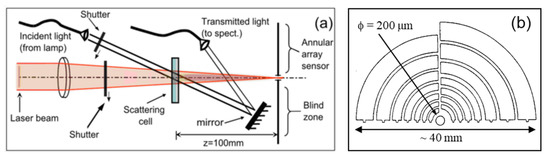 The apparatus for the coupled Low Angle Static Light Scattering (LA-SLS), and Multi Wavelength turbidimetry (MWT) consists of a homemade LA-SLS setup, which has been implemented with a commercial fiber optic spectrophotometer for MWT measurements in the IR-VIS-UV range. As shown in Figure 1a, by using two PC-controlled shutters, the sample cell can alternatively be illuminated with a focused laser beam (, ) or with a collimated white source beam. The LA-SLS sensor (Figure 1b) is made of 31 annular quarters of photodiode rings centered around the optical axis, where a pinhole allows the beam to pass clear. The detector is placed on the Fourier plane, i.e., the plane where the beam is focused. On this plane, each radial position corresponds to the same scattering angle via the relation , where is the distance between the cell and the sensor. Thus, since the minimum and maximum radii of the rings are and , the range of the detectable scattering angles is ().