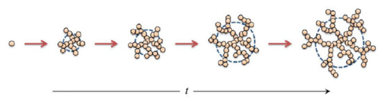 Pictorial description of the growth of a fractal colloidal aggregate. The mass and the gyration radius of the aggregate both increase with time, and they scale as , where is the mass fractal dimension of the aggregate. Picture reproduced with permission from Ref. [18].