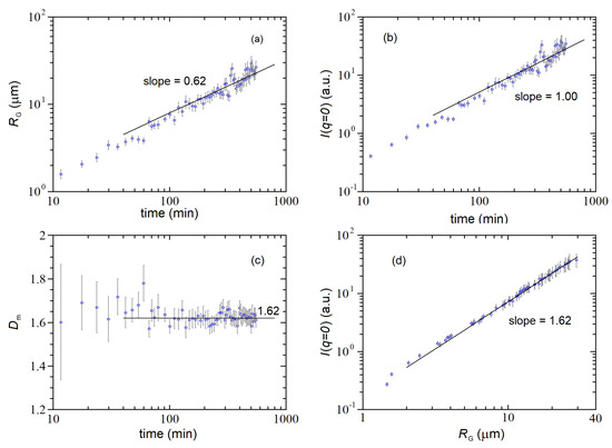 A further check that the aggregation followed a DLCA growth modality was found by studying the time behavior of and , which were recovered from data fitting (note that is proportional to , see Equation (22)). Indeed, Figure 5a shows that grows as a power-law characterized by an exponent of 0.62, which is consistent with . Similarly, Figure 5b shows that grows linearly with time, as expected for DLCA. Figure 5c shows that the fractal dimension of the clusters is consistent with during the entire aggregation process, but its recovery becomes rather accurate only when the clusters grow to sizes . Finally, Figure 5d shows that the scaling between follows Equation (39), which is a key signature of the clusters’ fractal morphology.
