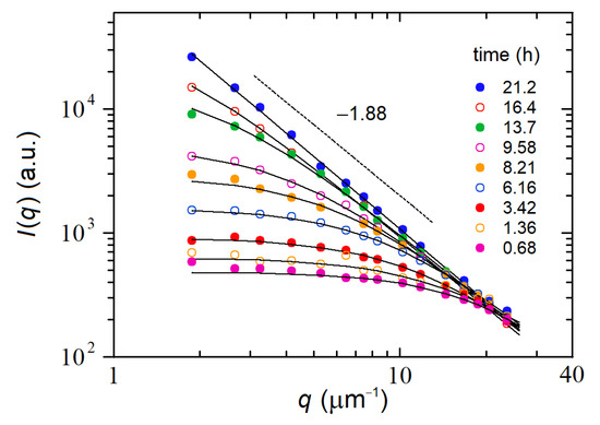 In our experiment, we used latex spheres in diameter (Thermo-Fisher Scientific Co.) at a concentration number (volume fraction concentration ), and the aggregation was induced by adding the divalent salt . The scattered intensities taken at different times after the addition of salt are shown in Figure 4 (open symbols) as a log-log plot. The figure shows the typical behavior expected for the evolution of the scattered intensities in a colloidal aggregation experiment: a strong (~2.5 decades) increase in the zero- scattered intensity, accompanied by a remarkable change in the shape of , with the curve roll-off moving towards small and the large- data laying on the same asymptote. The latter one is the signature of the aggregate’s fractal morphology and represents a measure of their mass fractal dimension because asymptotically () → . The data in Figure 4 were fitted to the so-called Fisher-Burford function [19].