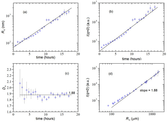 Time behavior of the gyration radius (a), mass (b) and fractal dimension (c) for the same aggregation clusters of Figure 4a; (d) behavior of zero-q intensity as a function of the cluster gyration radius . The three slopes reported in panels (a,b,d) are consistent with a DLCA growth modality characterized by a mass fractal dimension .