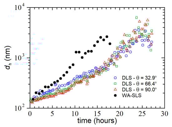 Comparison between the time evolution of the hydrodynamic diameters recovered via DLS at three different angles (open symbols) and the one recovered by using WA-SLS (dots). The latter one was estimated from the values (see Figure 7a), as described in the text.