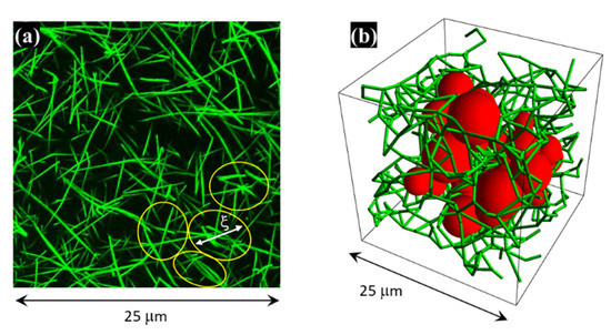 Figure 9a shows a typical rendering obtained from a stack of confocal images taken on an aged fibrin gel: the network is made of a collection of randomly oriented straight fibers joined together at some nodal points and separated by an average distance that is much larger than their diameters [41,42]. The fibers are almost monodisperse in size, but their density is not uniform, giving rise to correlated spatial density fluctuations that are characterized by a long-range spatial order, whose length scale is comparable with the distance between fibers.