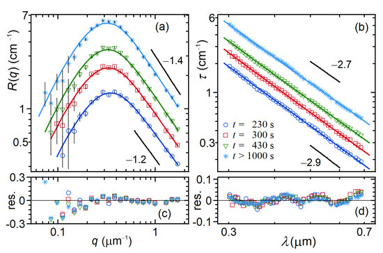 As described in Section 2.3, we can use the behavior of for estimating the mass fractal dimension of the aggregates via Equation (38), but this method apparently leads to a wrong value of . However, due to the wavelength dispersion of the refraction indexes of both polystyrene and water [14,15], the exponent expected from Rayleigh scattering is modified into an effective exponent of . Thus, from the slope measured at the latest time, we recover a value of , which is in excellent agreement with the fractal dimension recovered from the LA-SLS measurements.