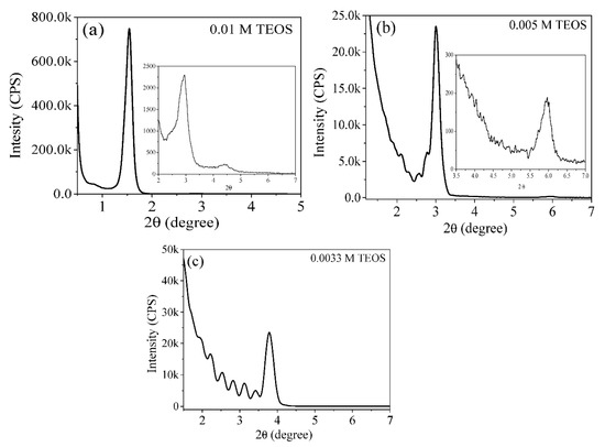 To form uniform and well-ordered silica mesopores, the concentration of silica precursor i.e., TEOS was carefully optimized [30,31]. Figure 1 shows the low angle XRD patterns of MPS thin films synthesized using 0.01, 0.005 and 0.0033 M concentration of TEOS respectively in the presence of Pluronic P-123 surfactant. The as-synthesized MPS thin films using 0.01 M TEOS predominantly exhibits the (100) reflection peak, the 2nd (200) and 3rd (300) order reflections at 1.54°, 2.95° and 4.42° respectively (Figure 1a) and these indicates a high degree of long range ordering in the MPS thin films. The absence of 3rd (300) order reflections, broadening of the main peaks and presence of additional multiple peaks were seen in mesoporous silica thin films prepared using 0.005 and 0.0033 M TEOS as shown in Figure 1b,c respectively, suggesting less structural ordering in the mesoporous silica thin films with lower TEOS concentrations [32,33,34,35]. The absence of a (110) reflection indicates that the porous arrangements within the films is 2D hexagonal and pores are parallel to the surface plane for 0.01 M TEOS with the P-123 system.
