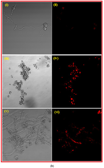 The anti-sporangiospores activity of PEI-f-Ag-NPs against mucormycotic agent R. arrhizus sporangiospores was further confirmed using fluorescent dye PI. The PI dye is membrane-impermeable and commonly used to stain cells with damaged or compromised membranes; red fluorescence emission usually indicates dead cells [18]. The PEI-f-Ag-NP 1 and 2 treated sporangiospores were incubated at their respective MIC values for 72 h. In addition, an aliquot was taken at different time intervals (24, 48, and 72 h) and stained with PI along with the control; it was observed using a confocal laser scanning microscope. The results showed that most of the sporangiospores were nonviable (PI-stained) within 24 h of treatment, as shown in Figure 6. At 48 and 72 h of treatment, germinated but nonviable mycelia were observed (Figure 6b,c).
