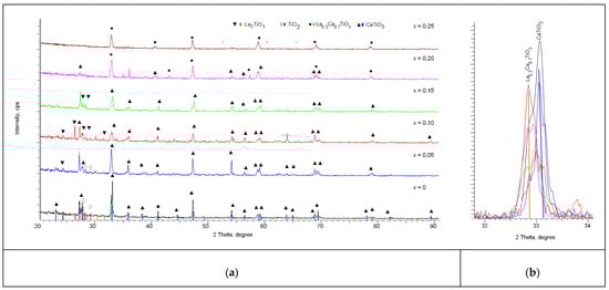 In the case of doped samples, the general dynamics of the changes in the diffraction reflexes indicate the processes of phase transformation with increasing dopant concentration, which is evidenced by the appearance of new diffraction reflexes, as well as the main shift observed in the original sample reflexes characteristic of the CaTiO3 phase. At lanthanum doping with concentration x = 0.05, the main changes in diffraction reflexes observed on the diffractogram correspond to the change of the CaTiO3 and TiO2 phases ratio, with the characteristic decrease of TiO2 phase content in ceramics composition. For these samples low-intensity diffraction reflexes are also observed in the region of 2θ = 28–33°, the presence of which can be associated with the formation of new phases, but their low intensity does not allow accurate identification of  them as full-fledged phases.
