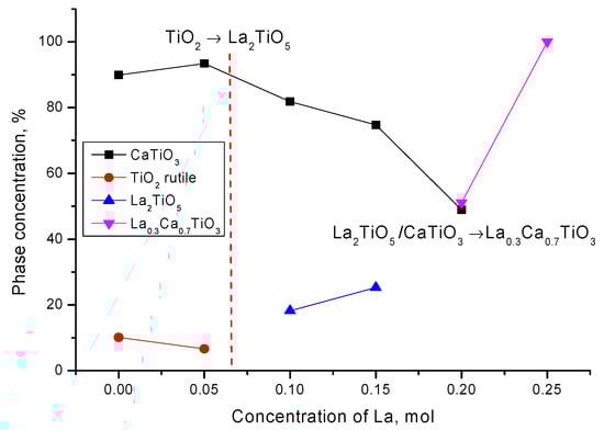 On the basis of the obtained data and the analysis, the dynamics of phase transformations depending on the concentration of lanthanum have been determined, which can be written down as follows: CaTiO