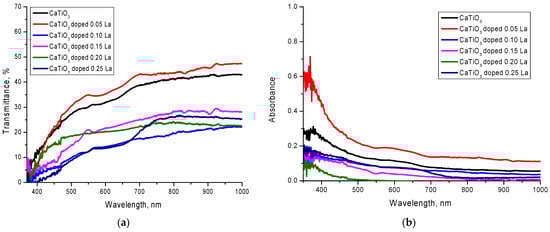 The optical properties of the synthesized lanthanum-doped ceramics were studied by UV-Vis spectroscopy using a Jena Specord-250 spectrophotometer (Analytik Jena GmbH, Jena, Germany) in the wavelength range from 200 to 1000 nm, in steps of 1 nm.