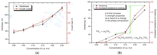 As can be seen from the data presented in the presence of TiO2-type impurity inclusions in the structure, as well as increased oxygen content, the strength properties are quite low, which indicates low strength and resistance to external influences. Doping with lanthanum leads to an insignificant increase in hardness and cracking resistance as well as strengthening of ceramics. Displacement of TiO2 impurity inclusions from the structure and formation of La2TiO5 phase leads to more than 20–25% hardening and an increase in crack resistance by 30–40%. The increase in the contribution of the La2TiO5 phase in the ceramics structure also leads to an increase in structural ordering, which also affects the strength properties of the ceramics. Formation of La0.3Ca0.7TiO3 phase in the ceramics structure according to the data changes in strength properties leads to a sharp increase in strength and cracking resistance that can be associated with both hardening due to displacement of impurity phases and reduction of oxygen concentration in the ceramics structure, and change in the morphological features and dislocation density of ceramics. The change in dislocation density is associated primarily with a decrease in the size of crystallites as well as their geometric shapes, which leads to the dislocation hardening effect characteristic of nanostructured or nanoscale materials. Such a strongly pronounced dependence of changes in the strength properties on the phase composition of ceramics, which are caused by variations in the dopant concentration, indicates that the main contribution to the effects of softening is made by impurity inclusions, a decrease in the concentration of which determines the hardening effect and an increase in resistance to external influences.