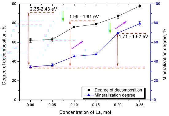 Figure 7 shows the results of changes in the values of photocatalytic decomposition efficiency and mineralization of organic dye decomposition products after 300 min of photocatalytic reactions for all tested lanthanum-doped ceramics.