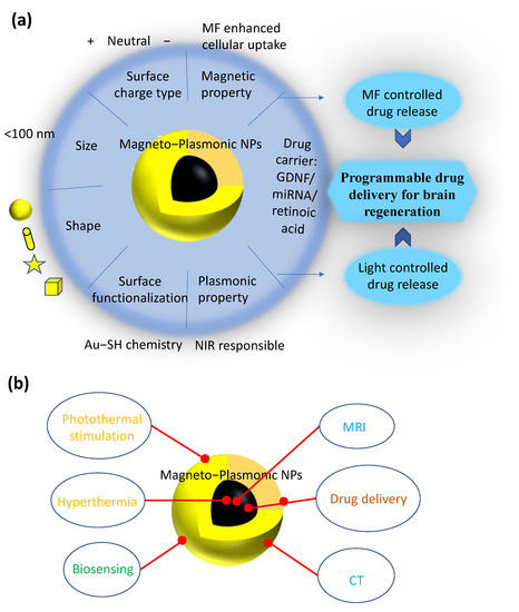 As one of the major threats to human health, neurodegenerative diseases (NDs) have an increasing prevalence in the elderly population due to the extended lifespan nowadays [1]. One of the promising therapeutic strategies for ND development in recent years is the use of nanocarriers to deliver neuroprotective and neurorestorative drugs [2], neurotrophic factors [3], and genes [4]. Among the potential nanocarriers, magneto-plasmonic nanoparticles (NPs) possess strong potential to overcome the current therapeutic limitation of ND. On the one hand, as shown in Figure 1a, their magnetic nature enables them to be externally directed by a static MF, to generate heat under alternating MFs, to cross the blood–brain barrier (BBB) under MF stimulation, and to regulate mechanosensitive ion channels [5]. On the other hand, their plasmonic nature enables the photothermal conversion capacity and the light-triggered neural regulation of temperature-sensitive ion channels [6]. Therefore, magneto-plasmonic NPs can serve as an outstanding platform to realize targeted drug delivery and external-stimuli-controlled drug release. In addition, they are capable of passing through the BBB because of their small size (1–100 nm) and ability to enable facile surface modification. The surface chemistry of magneto-plasmonic NPs also enables tunable surface functionalizations, which suggests that they could be superior drug carriers of various therapeutic agents to cross the BBB. These unique properties and biological functions allow for the wide usage of magneto-plasmonic NPs for brain-tissue and cellular regeneration, including photothermal stimulation, the biosensing of proteins/molecules, hyperthermia, bioimaging (magnetic resonance imaging (MRI), computed tomography (CT)), and drug delivery (Figure 1b).