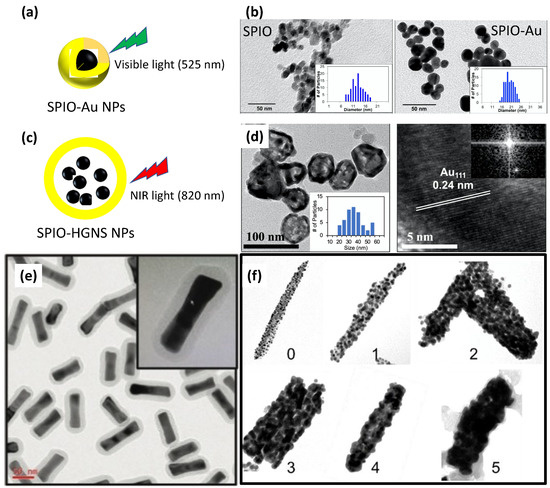 - Goldstein, D.; Han, C.; Mahan, M.; Doiron, A. Design of core–shell gold-coated superparamagnetic nanoparticles as a theranostic for targeted magnetic resonance imaging and photoablation therapy. Micro Nano Lett. 2019, 14, 1187–1191. [Google Scholar] [CrossRef]