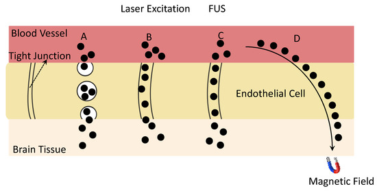 Schematic illustration of BBB-crossing pathways of magneto-plasmonic NPs assisted by surface functionalization and different external stimulations: (A) receptor-mediated transcytosis enhances the uptake of NPs functionalized with specific ligands; (B) paracellular transport of NPs by disrupting the tight-junction system under the irradiation of laser light; (C) paracellular transport of NPs by disrupting the tight-junction system under the exposure to FUS; (D) targeted passage of NPs through BBB directed by MF.