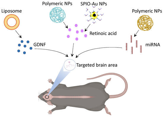 Schematic illustration of drugs and associated drug-delivery systems as potential treatments for ND. (Created with BioRender.com on 18 April 2022).