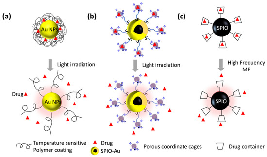 Schematic of different stimulus-type-triggered drug release: (a) light-stimulated drug release from Au NPs and drug-encapsulated temperature-sensitive polymers via plasmonically generated heat; (b) light-stimulated drug release from PCC-conjugated SPIO–Au NPs via plasmonically generated heat; (c) high-frequency MF-triggered drug release from drug container conjugated with SPIO NPs via hyperthermia effect.