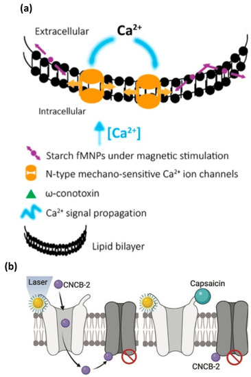 Graphical illustration of the mechanism of magnetic and plasmonic stimulation on neurons: (a) magnetic stimulation on magnetic NPs, which are located at cell membrane, to open mechanosensitive calcium channels (Copyright 2016 by ACS); (b) plasmonic stimulation of gold NPs to activate the opening of TRPV1 channel, and then allow the entrance of an N-type calcium-channel blocker (Copyright 2022 by Wiley).