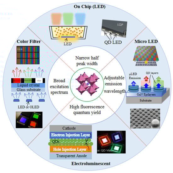 Compared with organic fluorescent dyes and rare-earth-doped phosphors, PQDs show excellent optical properties in the following four aspects: wide excitation wavelength range [22,40], high PLQY [40,41,42], adjustable emission wavelength [43,44], and narrow emission FWHM [45].