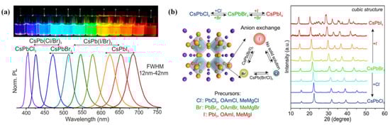 (a) Colloidal perovskite CsPbX3 NCs (X = Cl, Br, I) covering the whole visible spectral region with narrow and bright emission. Adapted with Open Access from [26]. Copyright 2015, American Chemical Society. (b) The anion exchange diagram and X-ray diffraction diagram of PQDs. Adapted with permission from [48]. Copyright 2015, American Chemical Society.