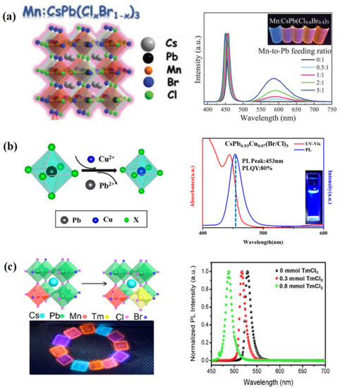(a) Mn2+ doping. Reproduced with permission from [71]. Copyright 2019, Wiley. (b) Cu2+ doping. Adapted with permission from [67]. Copyright 2019, American Chemical Society. (c) Tm3+ doping. Adapted with permission from [66]. Copyright 2019, American Chemical Society.